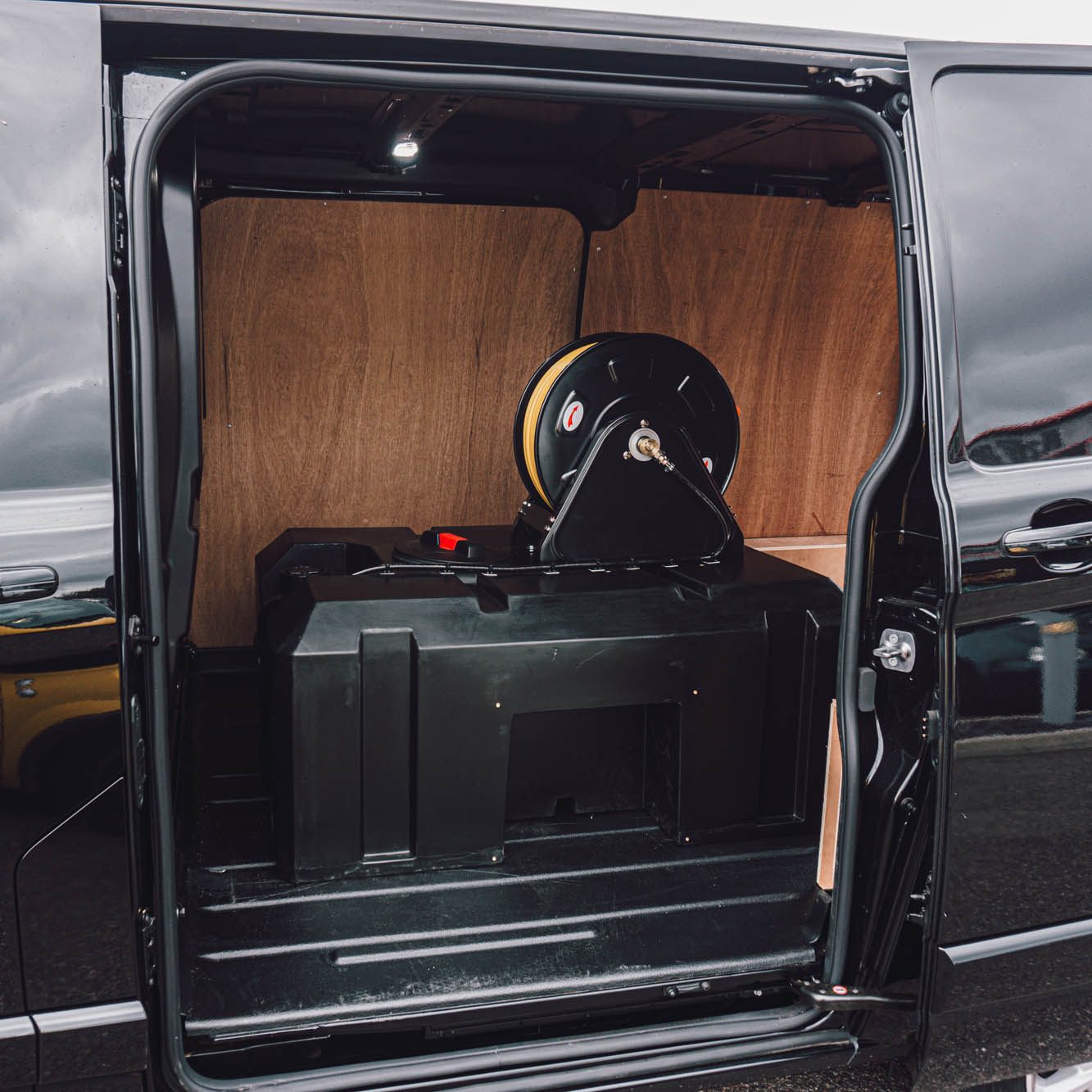 With a built in hose reel and compact footprint, the Compact systems are a perfect fit for smaller vehicles such as the Ford Transit Connect or Citroen Berlingo.