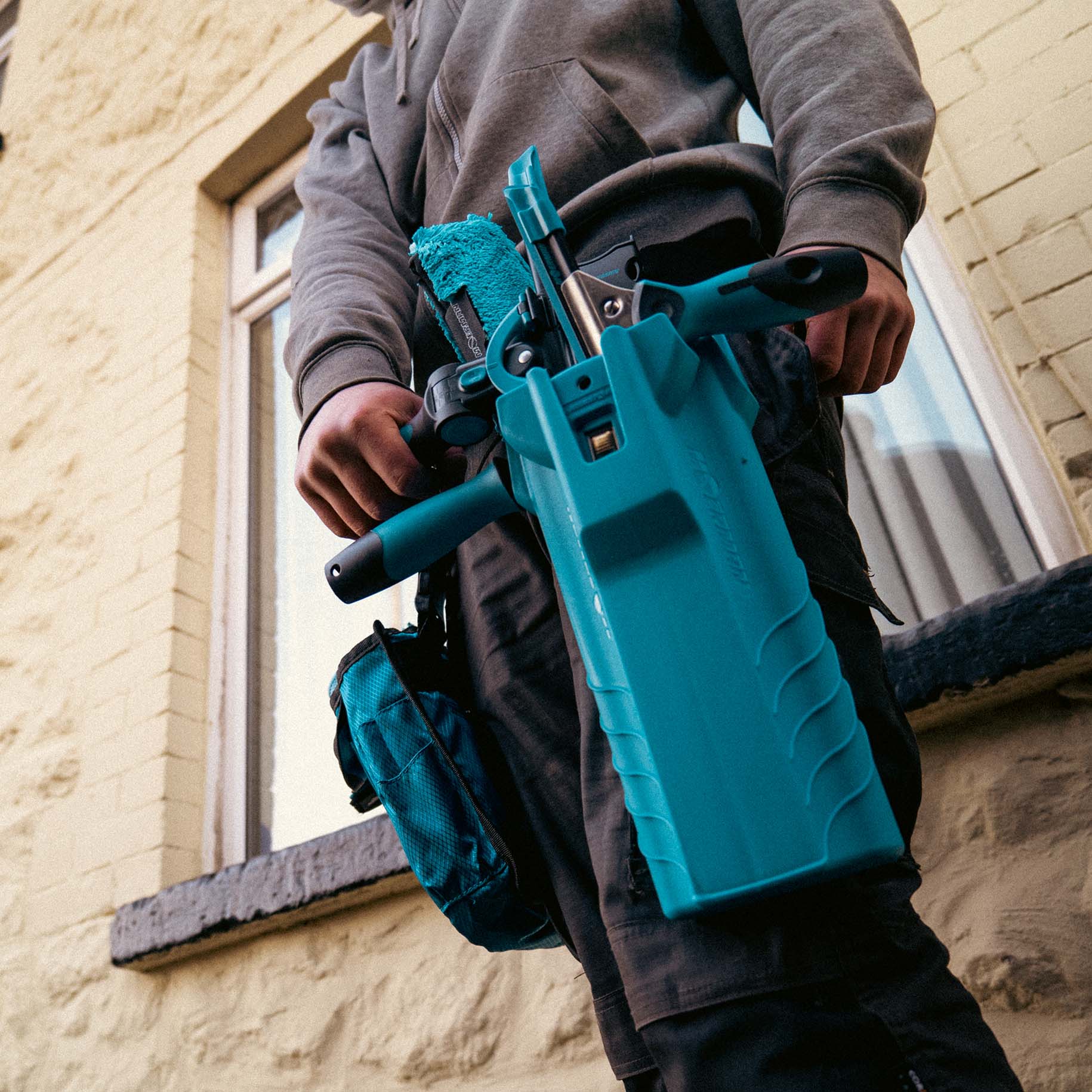 A hip bucket with multiple compartments to hold all of your gear and keep you comfortable on the go. This tool holder is robust and spacious, allowing you to store a number of hand tools, with a curved back that tapers to the contours of your leg and moves with you as you clean demanding windows.