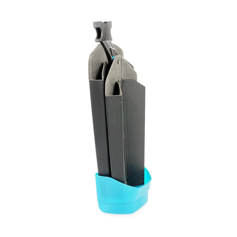 An extra-large and versatile bucket on a belt, set up to work as a double squeegee holder or squeegee holder and bucket combo. The DryWalker Flex features a drip catching tray and tapered design to ensure your leg stays dry and away from your hand tools!
