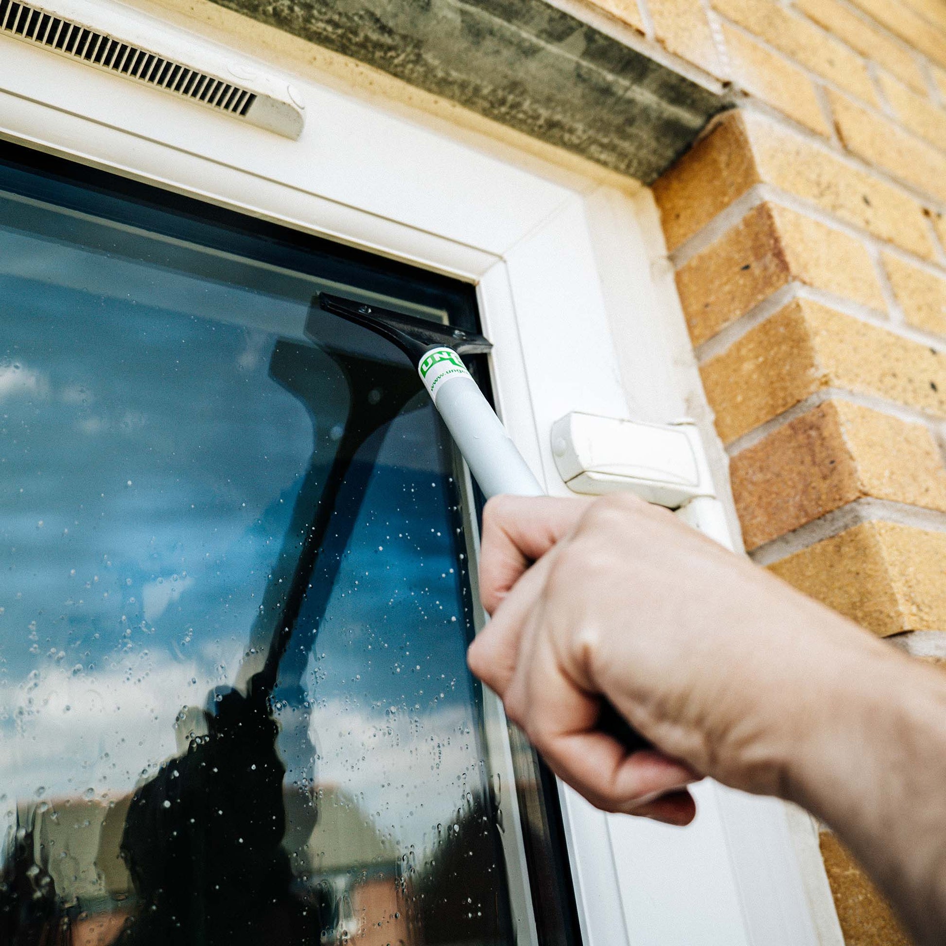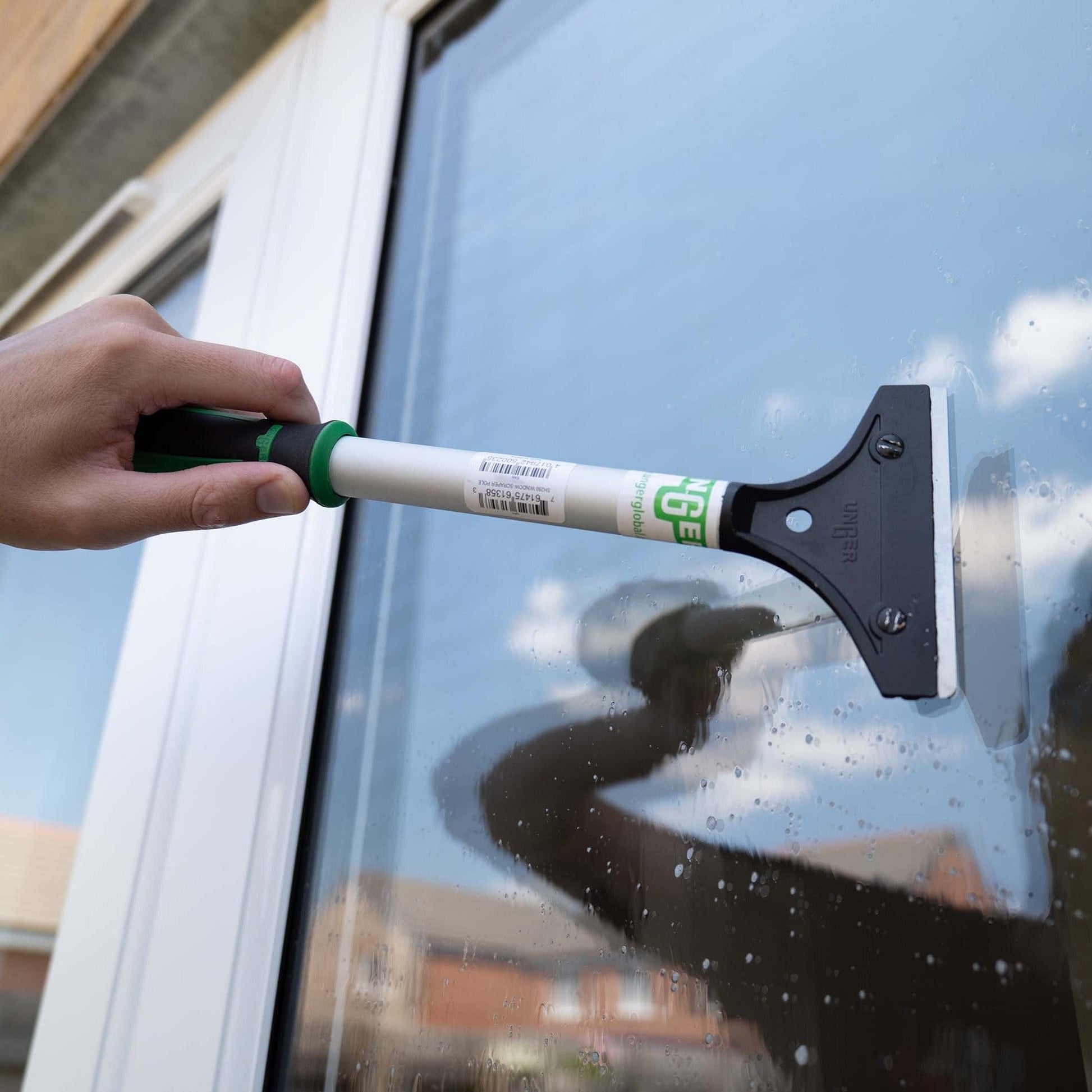 A long-handled Window Cleaning scraper, featuring a bi-component ergonomic handle, non-slip rubber coating and protective cap. The Unger ErgoTec® Long Handle Scraper features a 4''/10cm reversible blunt/sharp stainless steel blade