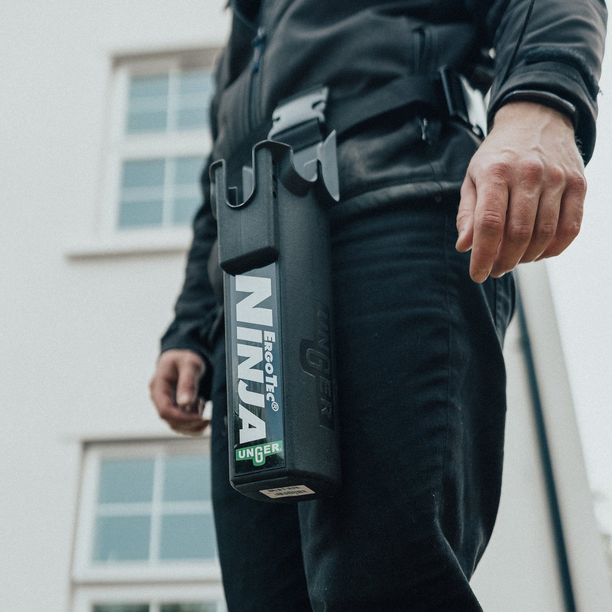 Unger ErgoTec® Ninja holster for traditional tools. This 'bucket on a belt' comfortably holds 2 squeegees and 1 washer, with a small pocket scraper department on the front., and features a quick-release buckle to add/remove it from your toolbelt.