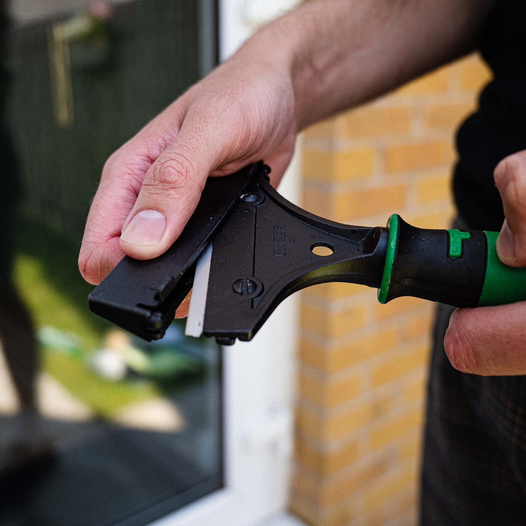 A robust Window Cleaning scraper, featuring a bi-component ergonomic handle, non-slip rubber coating and protective cap. The Unger ErgoTec® Surface Scraper features a 4''/10cm reversible stainless steel blade.